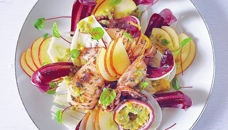 Un piatto succoso con perfetti contrasti di dolce e salato, morbido e croccante e quel sapore grigliato del calamaro alla piastra esaltato dall’acidità del limone e del frutto della passione!